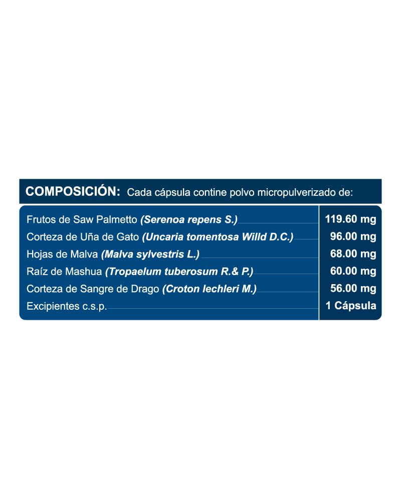 | Composición: | SAW PALMETTO: Aprobado por la ESCOP para el tratamiento sistemático de síntomas urinarios (disuria, poloquiuria, nicturia, retención |